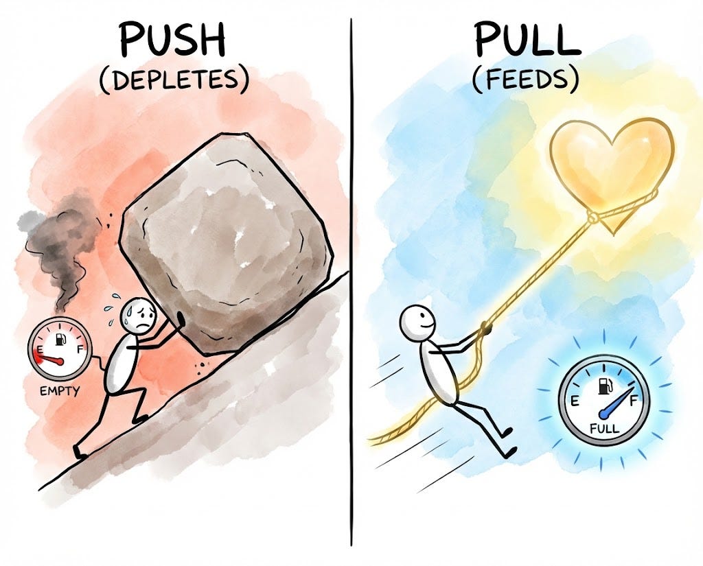 But push has a cost. It depletes. Every action requires energy output. You’re the engine, and engines need fuel. Stop pushing, it stops moving. Push harder, burn out faster.