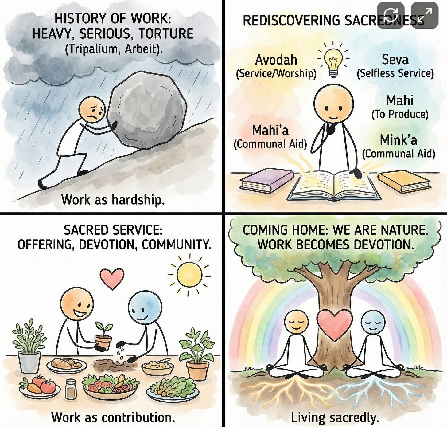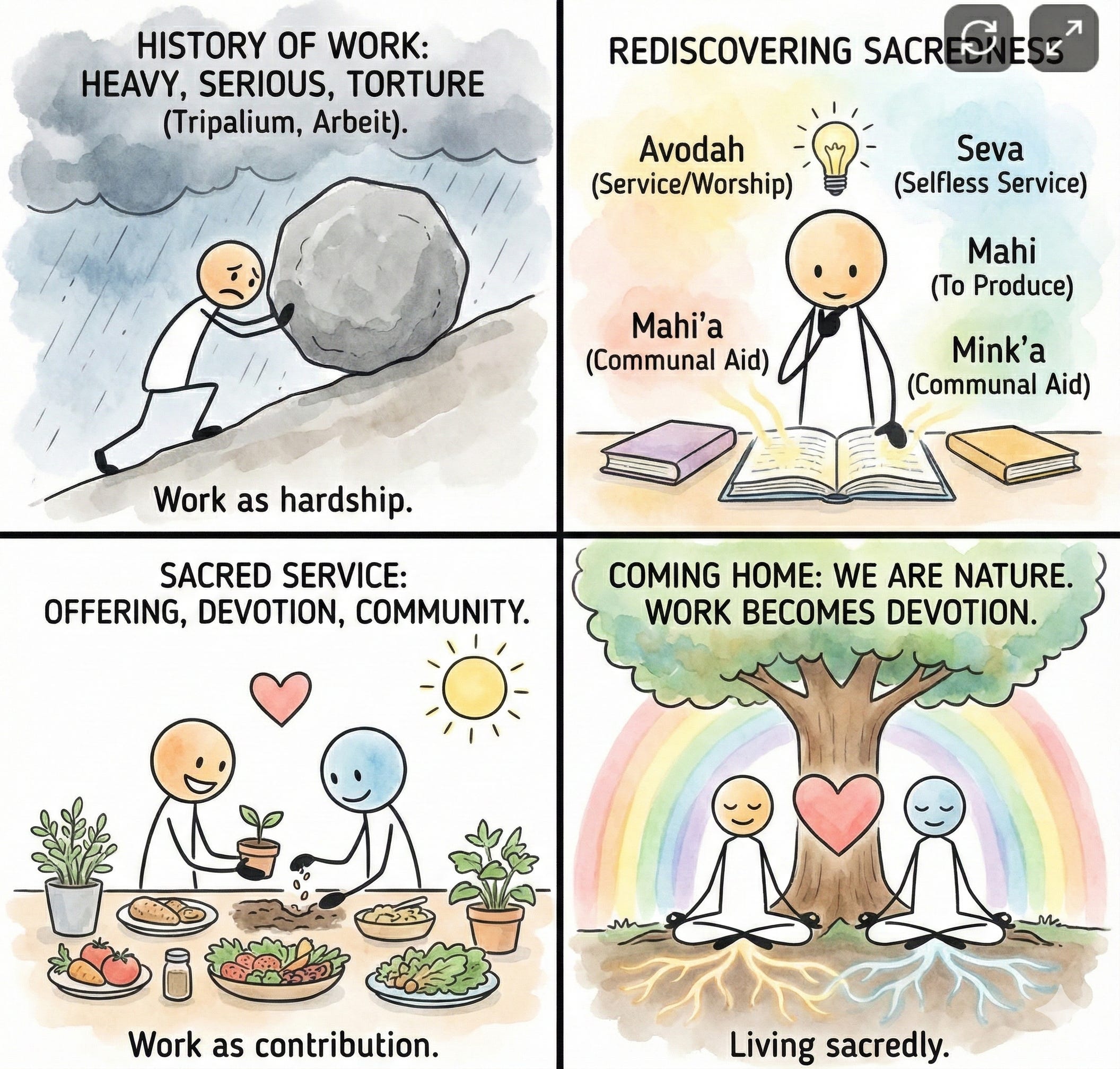And many Indigenous languages do not have a separate word for “work” at all, because activity is woven into ritual, community, reciprocity, land stewardship, belonging, seasonal cycles…