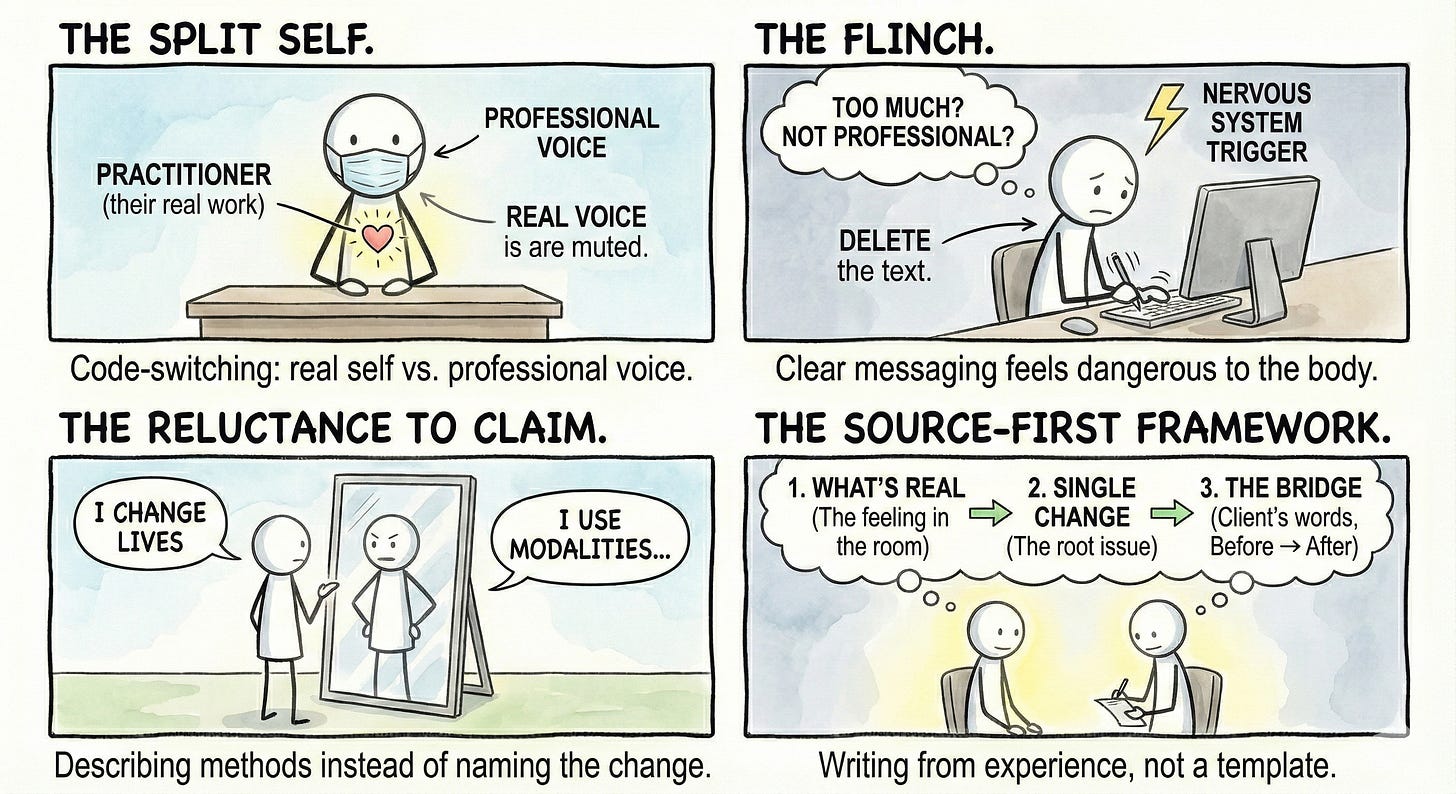 I’ve sat across from practitioners who’ve changed hundreds of lives. They can articulate sharp observations in real-time with clients. They’ve been told repeatedly that they have something real. And they can’t write a single paragraph about their work without deleting it twelve times.