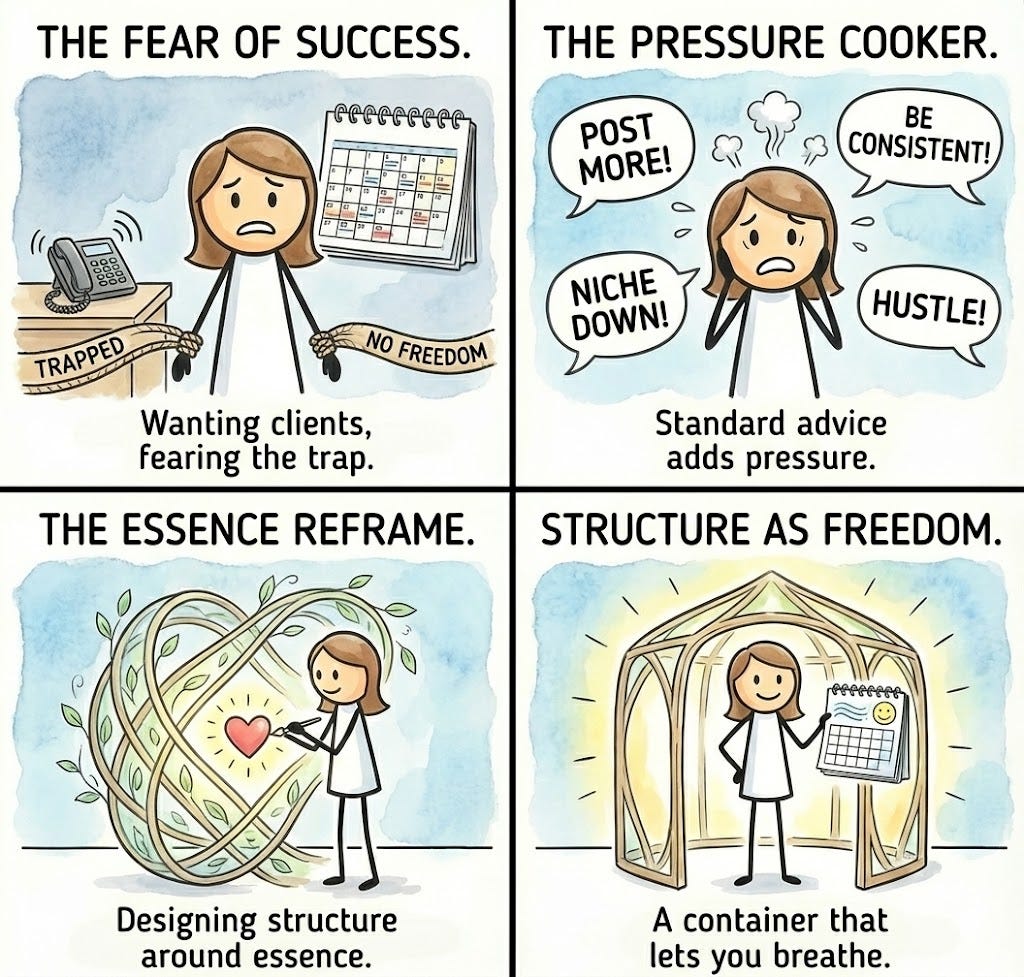 She’d just finished a landing page and was feeling really good about it. But the moment she imagined three clients booking in the same week, her stomach dropped. Not because she thought she couldn’t deliver, but because she imagined losing the spaciousness she built her whole life around.