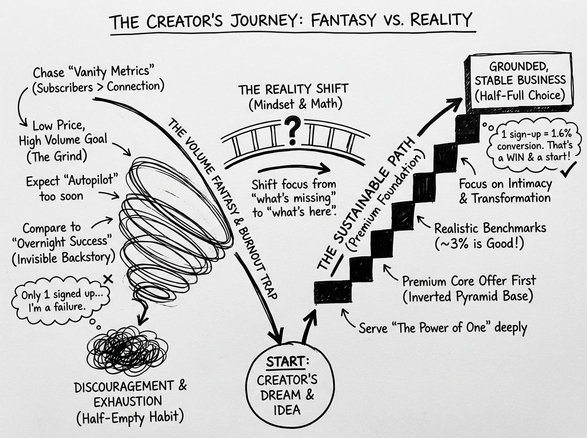 This is the math nobody does before they start dreaming about courses and memberships replacing their income. You run the numbers on your list size, your price point, and a realistic conversion rate, and suddenly you see why a small list can’t sustainably support a full-time business on low-ticket offers alone.
