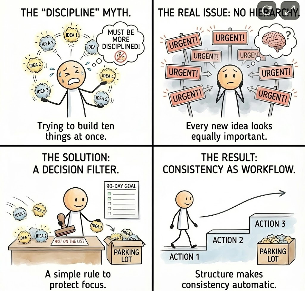 I see this with a lot of founders. They think it's a discipline issue but are really just trying to build ten things at once while telling themselves they're building one.