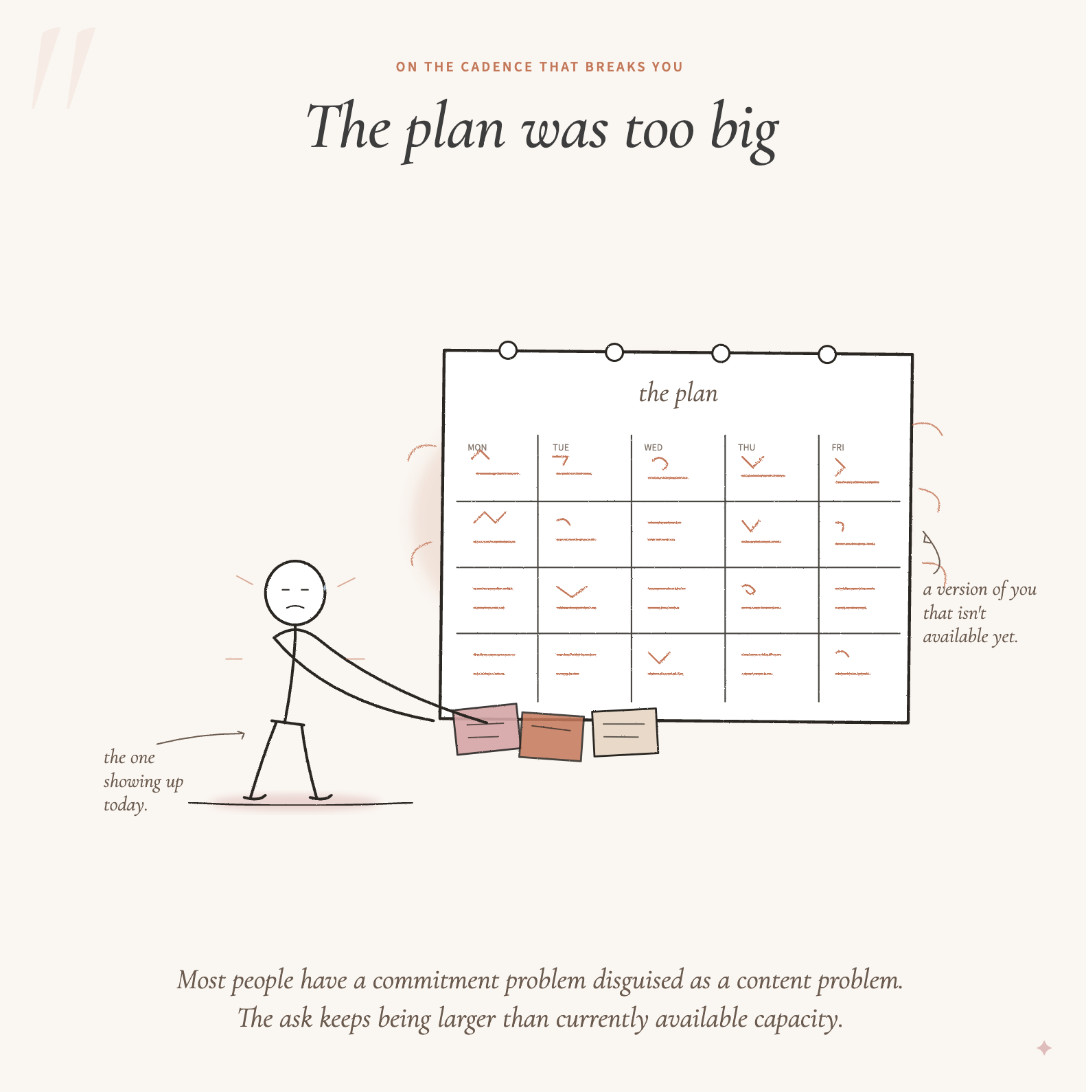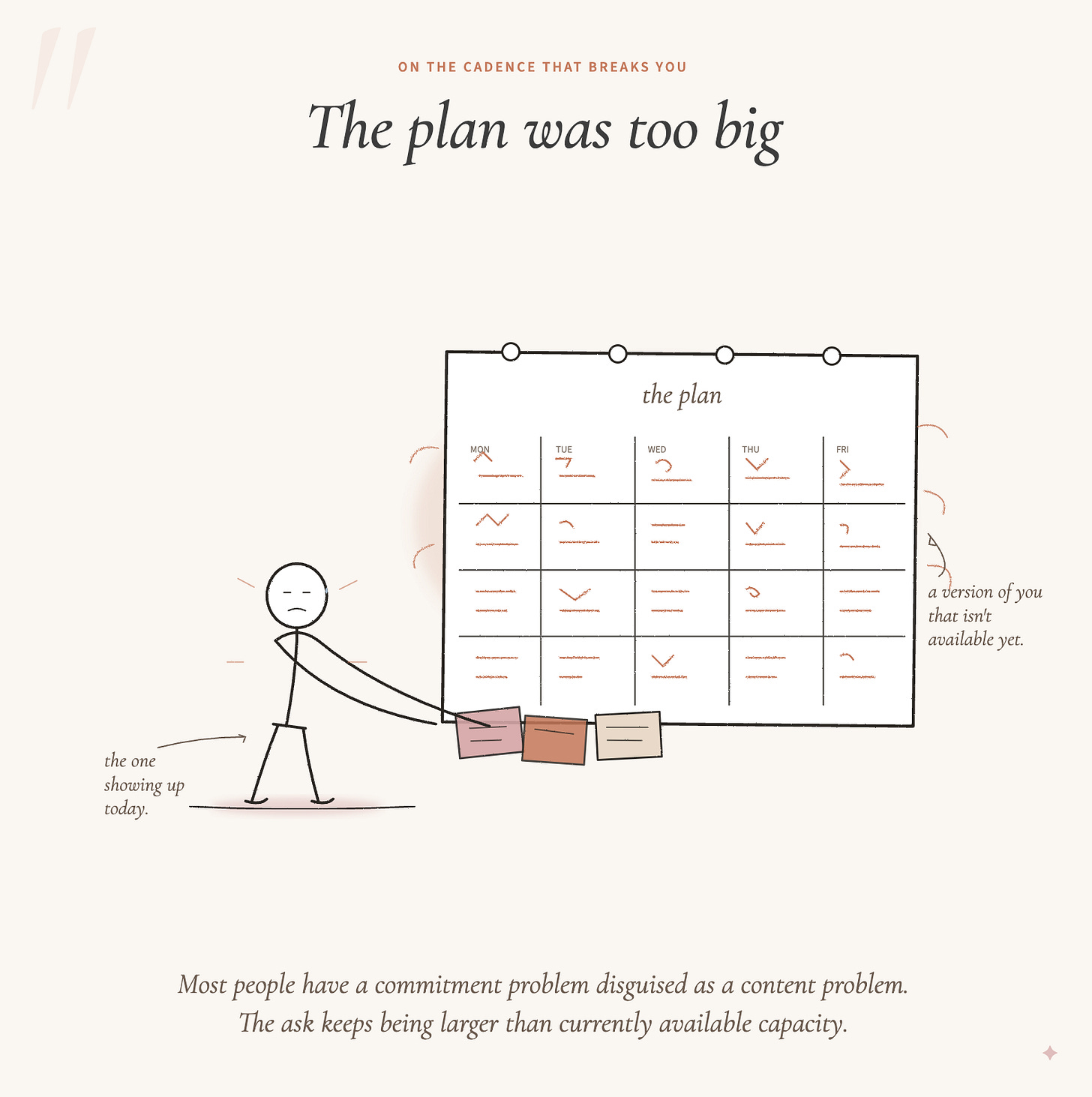 Most people I talk to have a commitment problem disguised as a content problem. They keep making plans that require a version of themselves that isn’t available yet. Twice a week. Every morning. The plan is sincere, the calendar is real, and the trust keeps getting broken, because the ask keeps being larger than the person can deliver on the day.
