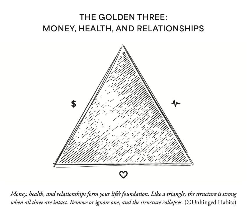 He presents life as a triangle with three competing priorities: Money. Health. Relationships. The goal isn’t perfect balance. It’s thickening each side, one at a time, through seasons of intensity, without letting the structure collapse.